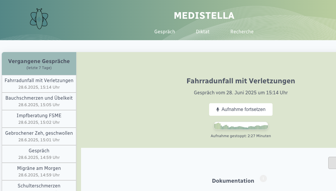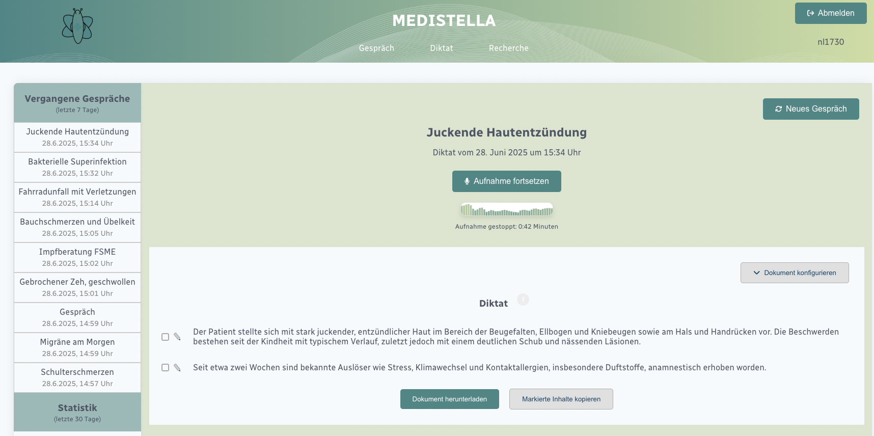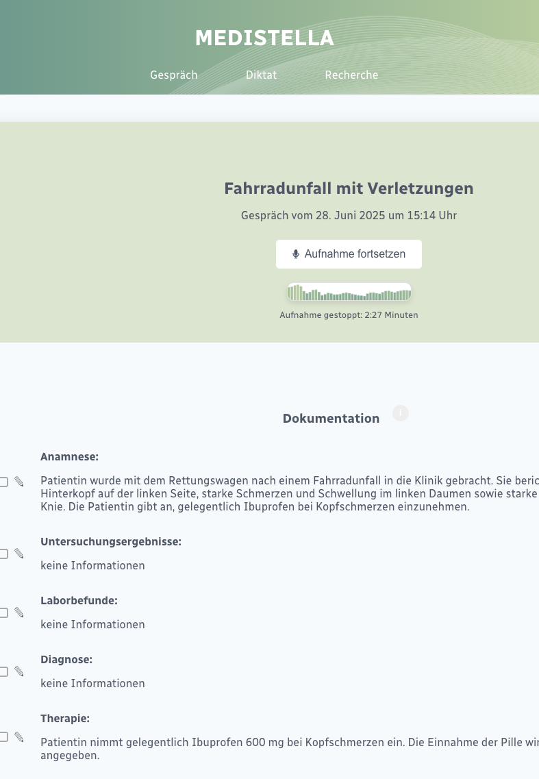 Bei der Medistella GmbH entwickeln wir moderne Anwendungen, die den Dialog zwischen Ärzt:innen und Patient:innen revolutionieren. Unser Ziel ist es, durch präzise Transkriptionen, intuitive Bedienbarkeit und smarte Zusammenfassungen die medizinische Dokumentation zu vereinfachen und gleichzeitig die Qualität der Versorgung zu steigern.