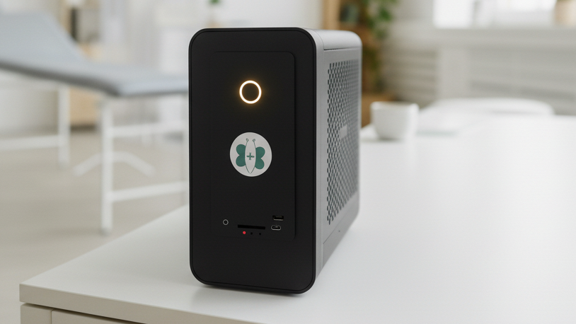 Die Medistella AI Box bringt moderne KI-Infrastruktur und Hochrechenleistung in Ihre Praxis. Auf ihr erfolgt die KI-Verarbeitung der Daten.